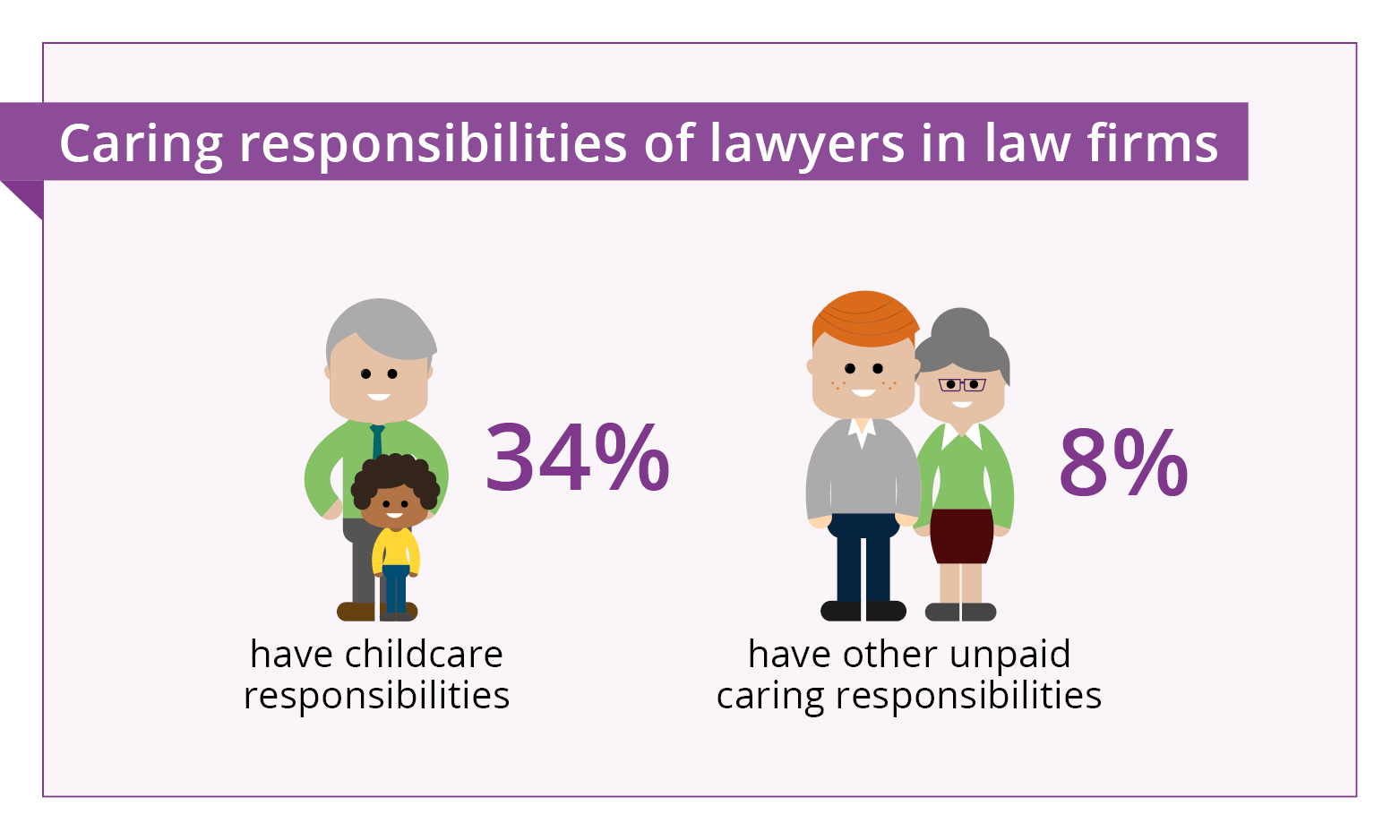 - 34% of lawyers had caring responsibilities for children, 8% had unpaid caring responsibilities for others with long-term physical or mental ill health.